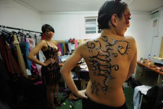 酒吧安排了很多热场表演,其中不乏外国舞者。上场前,女演员们在后台精心修饰自己,将各种艳丽的色彩披覆在身上。一名女孩腰上纹有中文字:“勇士,爱,力量,勇气。”