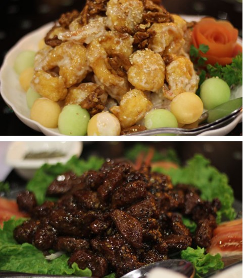 Let me jump in here. The picture above is the House Special Lobster, a fabulous dish made with lobster, scallions, spices, jalapenos, garlic and fresh noodles. Arguably one of the best dishes of the night, as well as my personal favorite, The Honey Glazed Walnut Shrimps, featuring shrimp, honey glazed walnuts, honey dew and cantaloupe (get all of them in one bite and you’re in for the treat of your life).