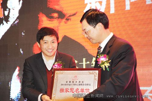演唱会承办方负责人向临水酒业总经理章永忠(右)授牌