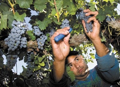José Reyes picks merlot grapes at San Juan Vineyard near Shandon in September. Like the previous year’s harvest, local grapes ripened later than average last year.