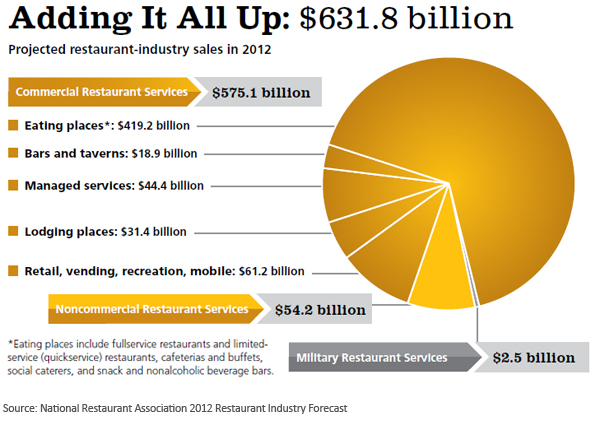The U.S. foodservice industry is expected to post sales totaling $631.8 billion in 2012, a 3.5-percent increase from last year and the third consecutive year of positive growth, according to the National Restaurant Association’s 2012 Restaurant Industry Forecast, released today.