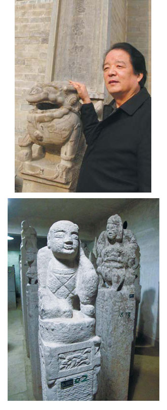 Top: Wang Yongchao stands beside a stone lion at his private museum. Above: Stone horse-hitching posts are collected at the museum. Photos by Zhang Zixuan / China Daily