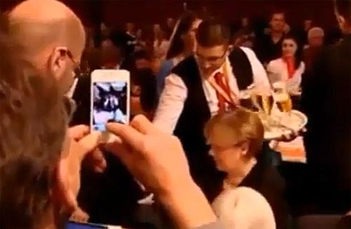 默克尔遭酒保啤酒泼身(视频截图)