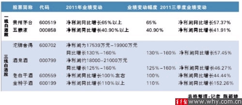 一三线白酒股2011年业绩预增报告比较