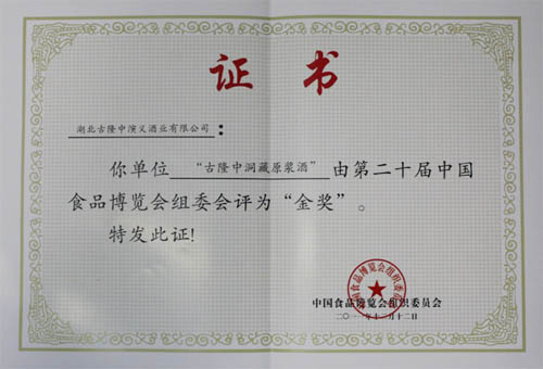 2011年12月12日至18日,第二十届中国食品博览会暨交易会在武汉国际会展中心举行。古隆中演义酒业携旗下主打产品——古隆中“洞藏原浆”年份酒精彩亮相,好品如潮。经组委会严格评选,古隆中“洞藏原浆”年份酒荣获第二十届中国食品博览会金奖。