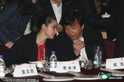 成龙现身北京,出席以他的名字命名的茅台首发式,莫文蔚、李玟、李冰冰等众多大牌明星盛装助阵。现场,成龙大爆李冰冰曾在一分半钟喝下一整瓶白酒,大赞其酒量好。仪式过后,众人一起用餐,成龙猛向李冰冰灌酒。