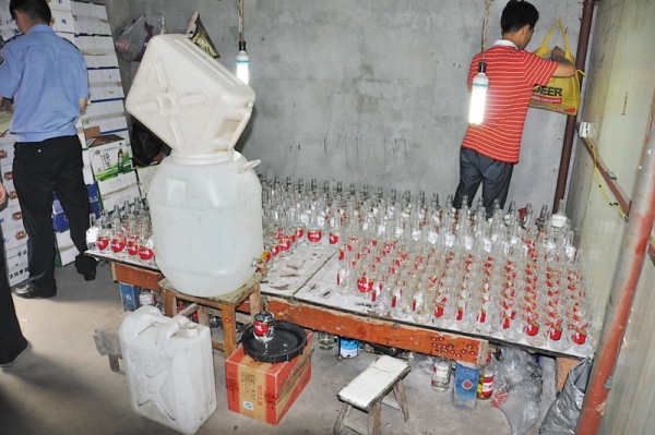 在查处的当天,苏州警方在他们的三个黑作坊中除了查获大量假酒和原浆外,还查获了各类白酒品牌标签3000余张、瓶盖1000多个,各类空瓶6000余个,并当场抓住了小老板孙某。据孙某交代,他们主要制作“五粮醇”、“海之蓝”、“金种子”等五类中、低档假酒,假酒的制作方法也很简单,工人在原浆桶上开孔,插上皮管,灌入买来的酒瓶中。为了牟取暴利,三个制假点24小时不间断生产,共投入了7辆车用于运输。