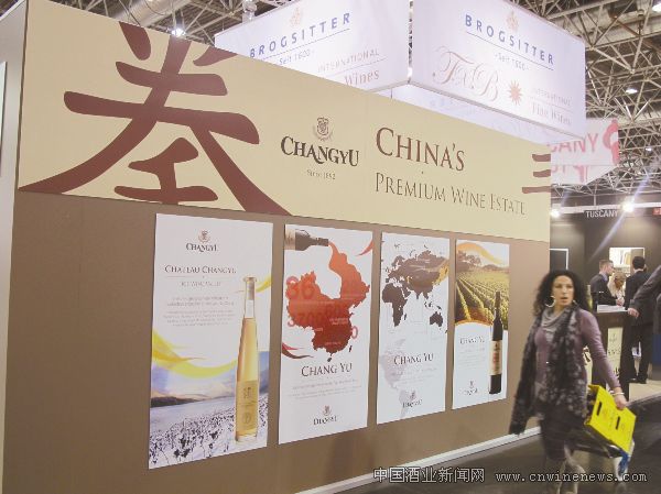 ProWein展会上,一位参观者经过张裕葡萄酒的广告牌。