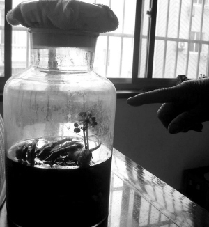 李大伯告诉记者,这瓶装着各种名贵中药材的酒,是亲戚在9年前用高度白酒浸泡的。两年前亲戚把这瓶酒送给了他,当时也没有发现有什么异常。他平常就放在家中的角落里偶尔喝一点,直到前天晚上,李大伯的儿子发现人参居然开花了。