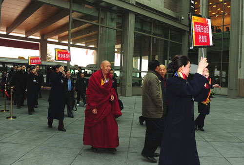 NPC deputies from Tibet Autonomous Region arrive in Beijing to attend the NPC and CPPCC annual sessions, Mar 1, 2012. [Photo/CFP]