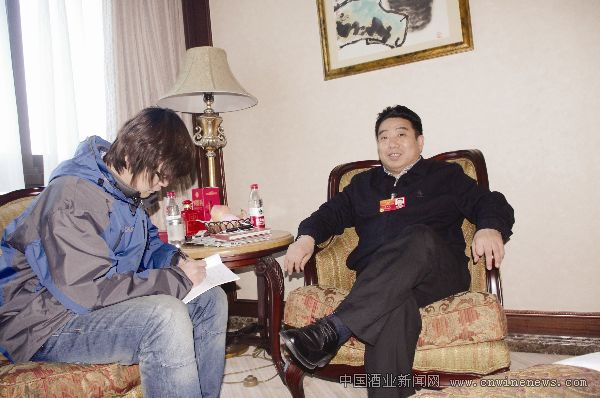 全国人大代表、辅仁药业集团董事长、宋河酒业股份有限公司董事长朱文臣(右)正在接受《华夏酒报》记者的采访。
