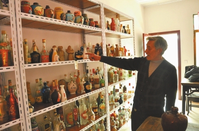 说起自己为什么会喜欢收集酒瓶的原因,方耕说,上个世纪八十年代儿子在发宝酒业上班时,他就开始接触酒瓶,加上八十年代中期,他在当时的陶宅乡当交流干部,负责搞乡镇企业工作,经常要到全国各地出差,有机会接触全国各地不同酒的酒瓶。“我自己本身虽然不喝酒,但是形形色色的酒瓶一下子吸引了我。”方耕说。