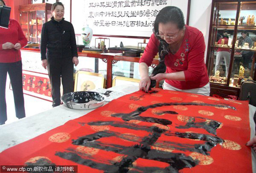 Ji Xiumei, 55, writes Chinese calligraphy with her hair in Cangzhou, North China's Hebei province, March 21, 2012. [Photo/CFP]