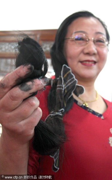 Ji Xiumei, a calligraphy lover shows her hair smudged with ink, March 21, 2012. [Photo/CFP]
