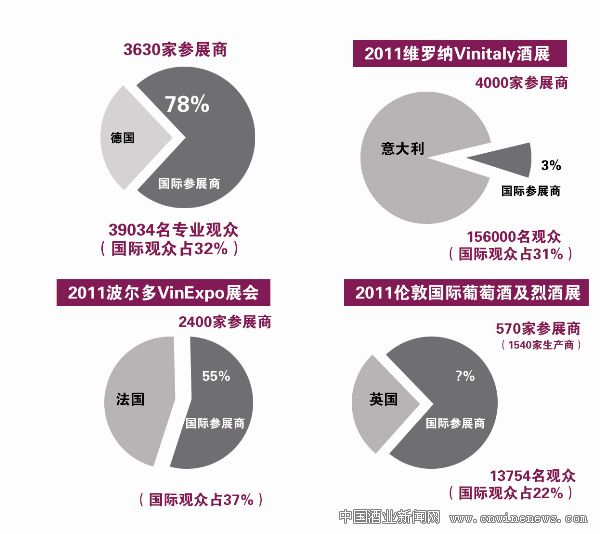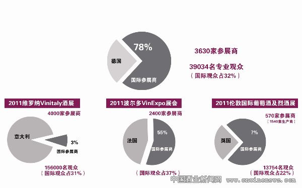 仅从参展商及观众的数目来看,意大利Vinitaly更胜一筹。但在这个历时5天的展会中,包含了周末两天的公众开放日。当地人习惯于成群相约到酒展尝酒,因此该展会的观众包含了相当一部分非专业观众的人数。而由于意大利本身为全球领先葡萄酒生产国,参展商多来自国内,国际参展商所占比例较低,参观者也多来自本国及欧盟国家。因此,该展会虽然规模可观,但更适合于对意大利及欧盟国家葡萄酒感兴趣的参观者。而ProWein 2011的 3635家参展商中,德国以外的国际展商占比高达78%,39034名专业观众中,国际观众占比达32%(该数据经过德国会展数据组织FKM审核)。