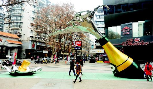 一个硕大的啤酒瓶倾斜着,啤酒喷涌而出,瓶塞和酒沫喷溅到地上。在汉口万松园路,这个充满情趣的雕塑吸引了不少路人的眼球。(记者刘大家 摄影报道)