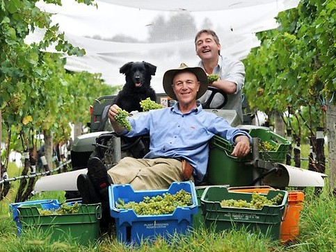 Hahndorf Hill owners Larry Jacobs and Marc Dobson and pooch Nero, with their valuable harvest of Gruner Veltliner. Picture: TRICIA WATKINSON