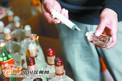 造假酒的人用塑料针管往原浆酒瓶里打入北京二锅头冒充原浆酒。