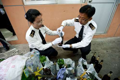 海关关员发现,水客团伙把啤酒瓶从中部切开成两截,再用与瓶子颜色相近的黑色塑料袋把手机包裹好塞进去,然后用透明胶布把两截啤酒瓶黏连起来并“恢复原样”。由于切割时,有些瓶子的标签受损,因此还被重新贴上一个新的假冒的标签。同时,故意在手推车的上面一层放置了几十个正常的啤酒瓶,掩护走私。
