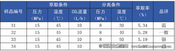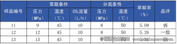 从表2可以看出,13号样品萃取率高且风味好,因此萃取压力确定为15MPa。