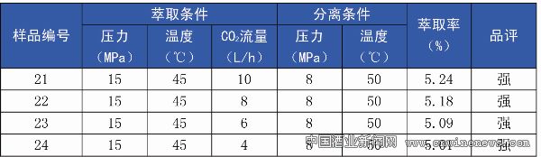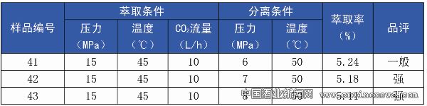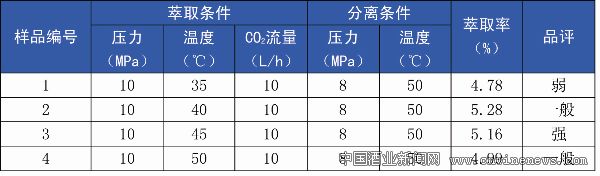 通过以上试验可以看出,3号样虽然萃取率略低于2号样,但其风味更佳,所以萃取温度选为45℃。