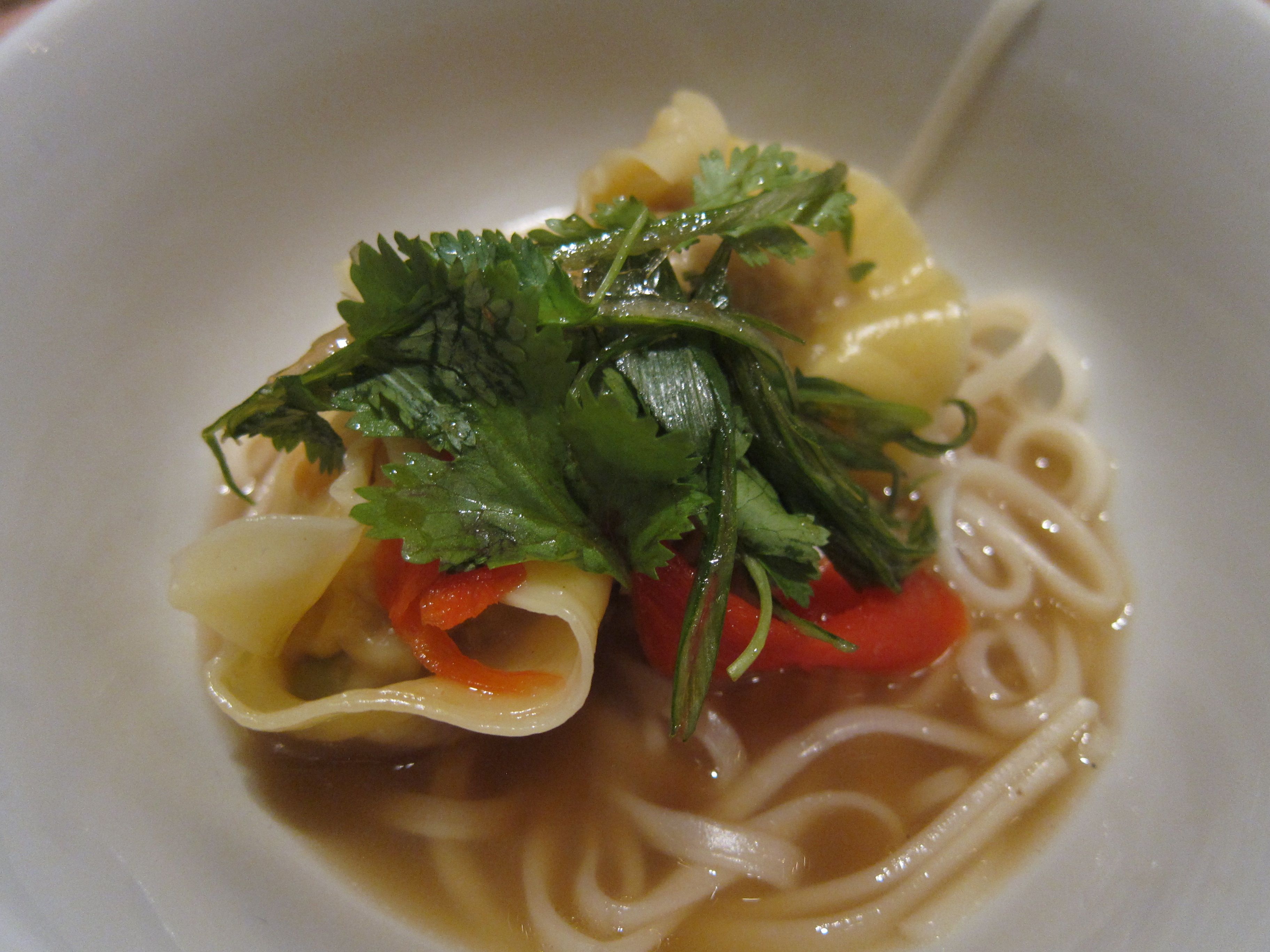 Jeannie demonstrated the latter by pairing up wine with a beautiful, soulful bowl of Black Bean Silken Tofu and Roast Duck Noodles -- a delicious broth flavored with ginger, offering a few meat-filled dumplings in addition to the marquee players. The wine? A Pinot Noir from the Pfalz, arguably German's best area for Pinot Noir: the 2004 "vom Muschelkalk" made by Rebholz, arguably Germany's best Pinot producer. A gentle thing, the wine was made richer by the soup, and reverberated particularly with the flavors of fermented black bean, ginger and meat. It was a match that flattered both the food and the wine.