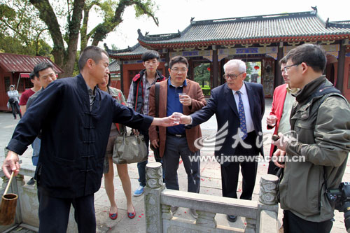 本报讯 记者刘祚保摄影报道:4月1日、2日,法国前总理、现任法国参议院副议长让—皮埃尔·拉法兰的哥哥吉拉德·拉法兰在法国法中科技交流委员会常务副会长王念的陪同下来赣“卖酒”。他对江西印象很好,认为江西人很有幸福感,称现在很多法国人也在学中国人用葡萄酒干杯。