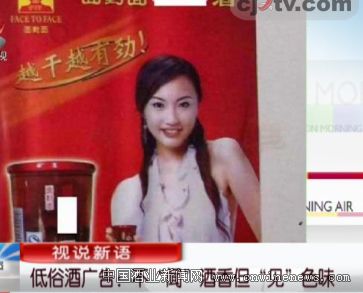 低俗酒广告:不“闻”酒香但“见”色味:前两天有位网友在自己的微博里上传了一张图文帖子,说是清明小长假期间,他到美丽的江西婺源游玩,看到大街上悬挂着一幅很大的酒类广告宣传画,画面上一位妙龄少女手捧着一罐某品牌的养身酒,画面上还配着几句广告词,是这么写的:“面对面,某某酒,越干越有劲。”