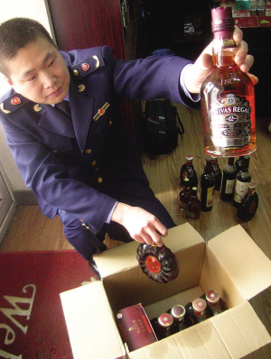 本报讯 (记者时继凯文/摄) 2日哈市工商部门对红旗大街上一处烟酒专卖店检查发现,名烟名酒在这里都能找到,而且售价极低,经查此处销售的XO和芝华士等洋酒,以及高档香烟全是假货。