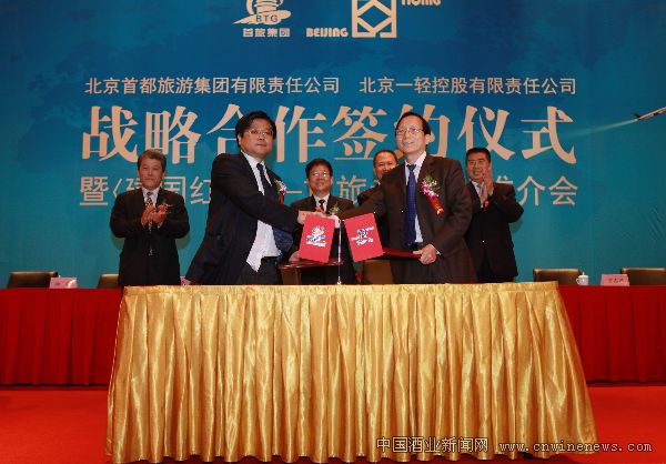 2012年5月18日,在北京市委、市政府的大力支持和市国资委的直接领导下,北京首都旅游集团有限责任公司(简称首旅集团)与北京一轻控股有限责任公司(简称一轻控股公司)战略合作签约仪式暨建国红星——首旅专用酒推介会在北京国际饭店紫金厅举行。北京市国资委副巡视员屈少波,首旅集团董事长段强、总经理刘毅、常务副总经理丁同欣,一轻控股公司董事长张金钢、总经理苏志民、副总经理彭林等领导出席签约仪式,共同见证两大国有企业开启战略合作的重要历史时刻。