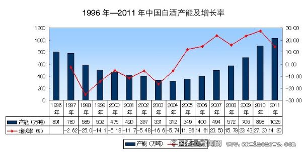 从2011年白酒发展来看,整个行业发展势头良好:产量、销量、利润均保持30%以上的增长,其中销售收入增速高达54%,白酒行业迎来全面增长,形势较为乐观。白酒行业销售收入的增长快于产量的增长,并且利润增长高于销售收入的增长,说明白酒行业的产品结构进一步优化,但超高端白酒增长疯狂,缺失理性。预计2012年,白酒行业销售收入及利润仍将以30%以上的速度递增。
