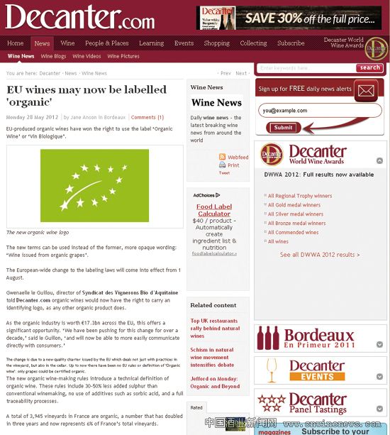 欧盟有机葡萄酒标准将于今年8月1日正式实施,获准生产商可直接标称“有机葡萄酒(Organic Wine/Vin Biologique)”,而在此之前只能标称“以有机葡萄酿制”。如同其它有机产品一样,欧盟的有机葡萄酒将带有一个消费者容易识别的标识。