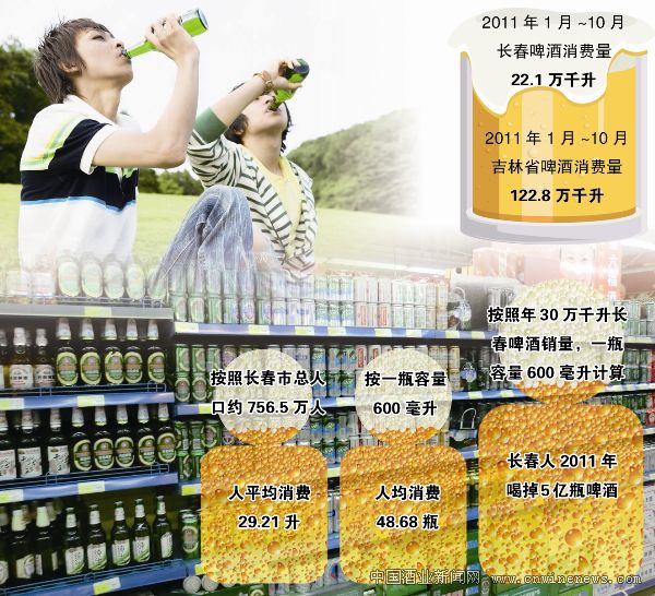 日前,苏赛特商业数据有限公司东北三省2011年前10个月的啤酒消费量统计数据显示:前10个月,吉林省为122.8万千升,其中长春市消费掉22.1万千升。为此,有业内人士预计,去年全年长春市啤酒销量已经超过30万千升。