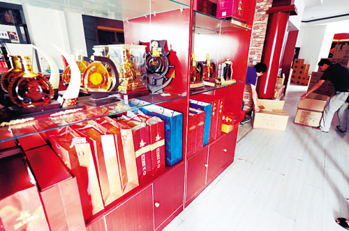 此时,记者注意到,在一楼大厅的左面有一条窄窄的通道,从这条通道走过就到了大厅的后面。这里面竟是大大的陈列柜台,其中很大一块就是专门陈列洋酒的。记者粗略地数了数,差不多有近10种洋酒在此展示。摆在洋酒下边的售价标签清晰可见,从780元—980元/每瓶不等。当被拉到该陈列柜前时,崔女士一句话也说不出来。