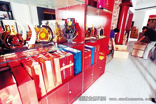 此时,记者注意到,在一楼大厅的左面有一条窄窄的通道,从这条通道走过就到了大厅的后面。这里面竟是大大的陈列柜台,其中很大一块就是专门陈列洋酒的。记者粗略地数了数,差不多有近10种洋酒在此展示。摆在洋酒下边的售价标签清晰可见,从780元—980元/每瓶不等。当被拉到该陈列柜前时,崔女士一句话也说不出来。