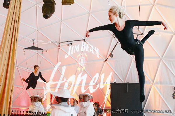 仿佛置身于一个巨大的“蜂巢”中,嗡嗡声不绝于耳,飞舞在空中的“蜜蜂”们不时地做出一幕幕扣人心弦的杂技表演,“养蜂人”们则忙于为客人端上美味的饮品。这是占边为庆祝新品Jim Beam Hon