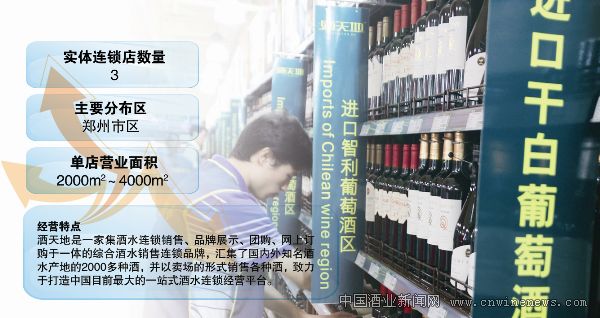 就在酒便利、大河酒城快速裂变的同时,又一家大型连锁酒类超市——酒天地在郑州市场上再度掀起酒类流通波澜。2011年9月6日,由河南酒天地商贸有限公司操盘的酒天地第一家店在郑汴路开业,该店经营面积近4000平方米,不仅在河南省,在国内市场也是首屈一指的专业销售酒水的大卖场。