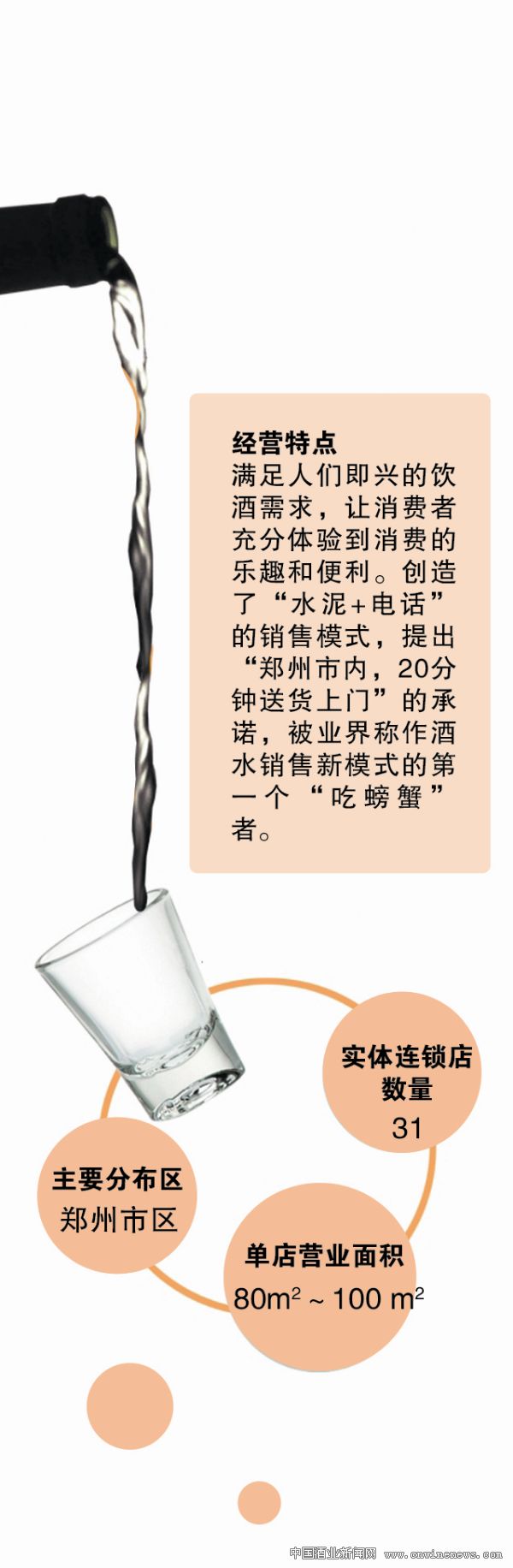 2010年2月,以宅急送为特色的河南宅乐送商贸有限公司进入筹备阶段,运营酒便利品牌;2010年6月22日,酒便利第一批6家门店进入试营业,到现在已经运营两年了。6月6日,《华夏酒报》记者从河南宅乐送商贸有限公司了解到,截止到目前,酒便利已经在郑州市开设了31家门店,这些连锁店统一装饰、统一采购、统一价格、统一配送,其位置都是在郑州市的居民聚集区或者交通主干道旁,每家门店的营业面积在80m2~100m2,陈列的酒品都在400个品种以上。
