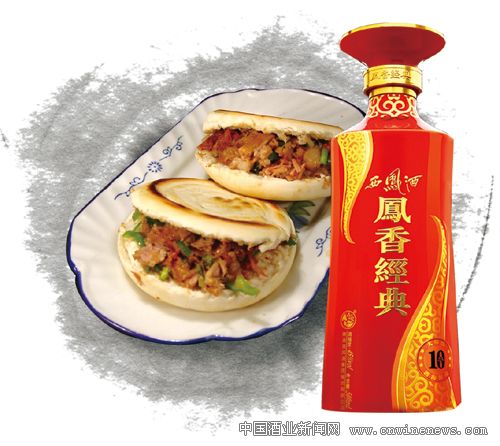 西安肉夹馍 西凤酒 肉夹馍,合腊汁肉、白吉馍为一体,互为烘托,将各自滋味发挥到极致,馍香肉酥,色泽红润,气味芬芳,郁醇香,入口即化回味无穷。正如西凤酒的口感,清雅而不淡薄,浓郁而不酽腻,甘润挺爽、诸味谐调、尾净悠长,为喜饮烈性酒者所钟爱。
