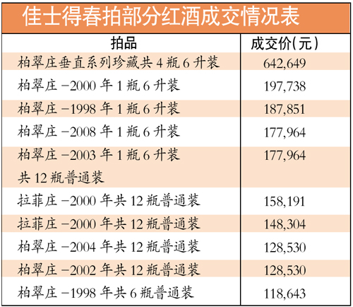佳士得亚洲区名酒部主管暨葡萄酒大师葛帝斯总结拍卖情况时称,大瓶装的佳酿备受追捧,多数拍品以高于拍前最高估价成交,如四瓶六升装的柏翠庄垂直系列珍藏以逾780000港元拔得全场头筹,标志着亚洲藏家收藏兴趣的转换:“即使在不明朗的经济环境下,珍贵佳酿仍为藏家们热衷的投资领域。”