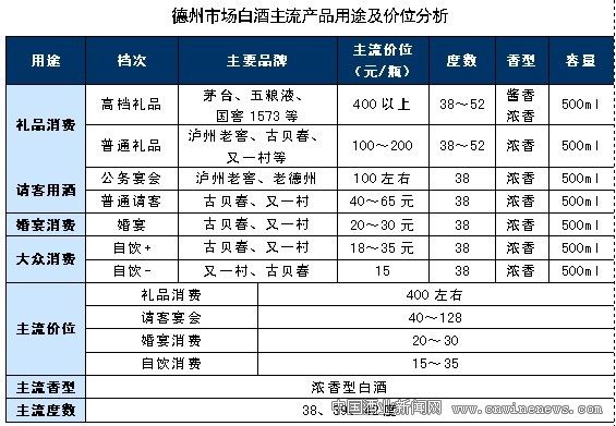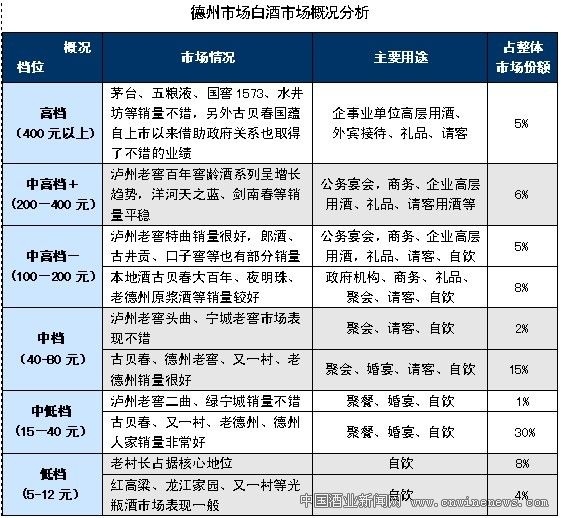 1)从白酒价位消费来看,德州市场竞争呈椭圆形,高端和低端消费不明显,中端价位消费突出。高档酒以八大名酒为主,外地酒占据主导地位;中档酒以地产酒为主,主要品牌有古贝春、又一村、宋楼醇香等;低档酒有老村长、龙江家园等。