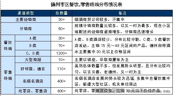 2)德州市A/B类酒店较少,C类、D类餐饮店发达,全市有1300多家餐饮店,酒店渠道发达。名烟名酒店、连锁超市共有500多家,且分布均匀,满足了消费者的购买需求。
