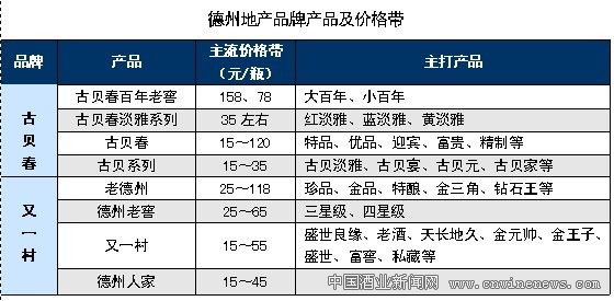 德州市区礼品消费白酒在100元以上的产品,以茅台、五粮液等八大名酒及系列子品牌为主,另有少数古贝春、又一村的高档礼盒酒;请客、商务、朋友聚会用酒一般以40元~128元为价格区间,主要是当地的老德州、又一村精装酒和古贝春高档酒等;婚宴用酒主要集中在20元~30元价位,以当地白酒品牌为主,尤其是古贝春、又一村的喜庆专供用酒比较畅销;大众消费一般在15元~35元,当地的又一村、古贝春占据绝对优势。
