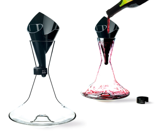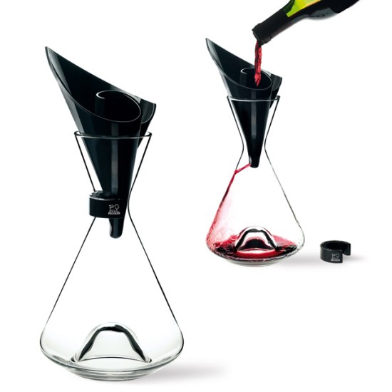 葡萄酒由漏斗式加速醒酒器的中心处倒入,经由较短的流动过程减缓与空气接触的氧化过程。瓶底以较为窄小的空间设计,提供适度接触空气的面积,以保留红酒里的香气。