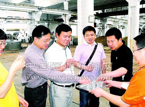 图为采访团记者们在沱牌集团有限公司生产车间品尝沱牌原酒。