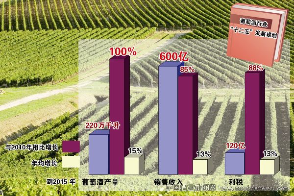 在《规划》中制定的行业发展目标是,到2015 年,葡萄酒产量达到220万千升,比2010年增长100%,年均增长15%;销售收入达到600 亿元,增长85%,年均增长13%;利税120亿元,增长88%,年均增长13%。
