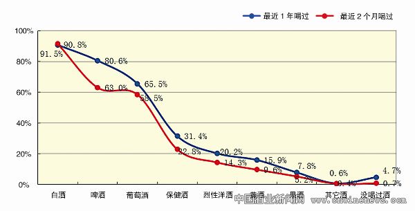 根据调查显示,在最近1年里,武汉消费者喝过各种酒类产品的比例,即酒类消费渗透率依次为:白酒90.8%,啤酒80.6%,葡萄酒65.5%,保健酒31.4%,烈性洋酒20.2%,黄酒15.9%,果酒7.8%,其它酒0.6%。其中白酒具有显著的领先优势(见图2)。而从最近2个月的各酒类消费渗透率的排序中也可以看出,与上述最近1年里的渗透率的排序完全一致。调研显示,消费者招待客人会首选白酒。
