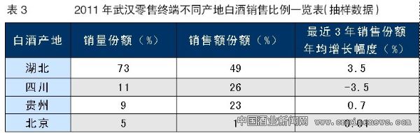 2011年武汉零售终端不同产地白酒销售比例一览表(抽样数据)(表3)