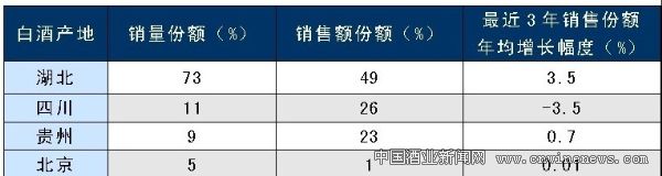 消费者经常喝或者购买的白酒出产地依次为:湖北94.6%,四川35.3%,贵州30.2%,选择其它产地的比例均在10%以下。年龄层次高、喝酒频次程度高的消费者选择四川、贵州的比例相对较高。消费者认为最好或最信赖的白酒出产地依次为:湖北72.2%,贵州39.8%,四川33.4%,选择其它产地的比例均在5%以下。另外来自零售终端的抽样数据也证明了上述情况。见表3和图3。