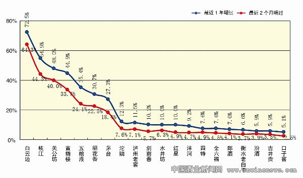 武汉市场各酒类在最近1年和最近2个月里的消费渗透率(图2)